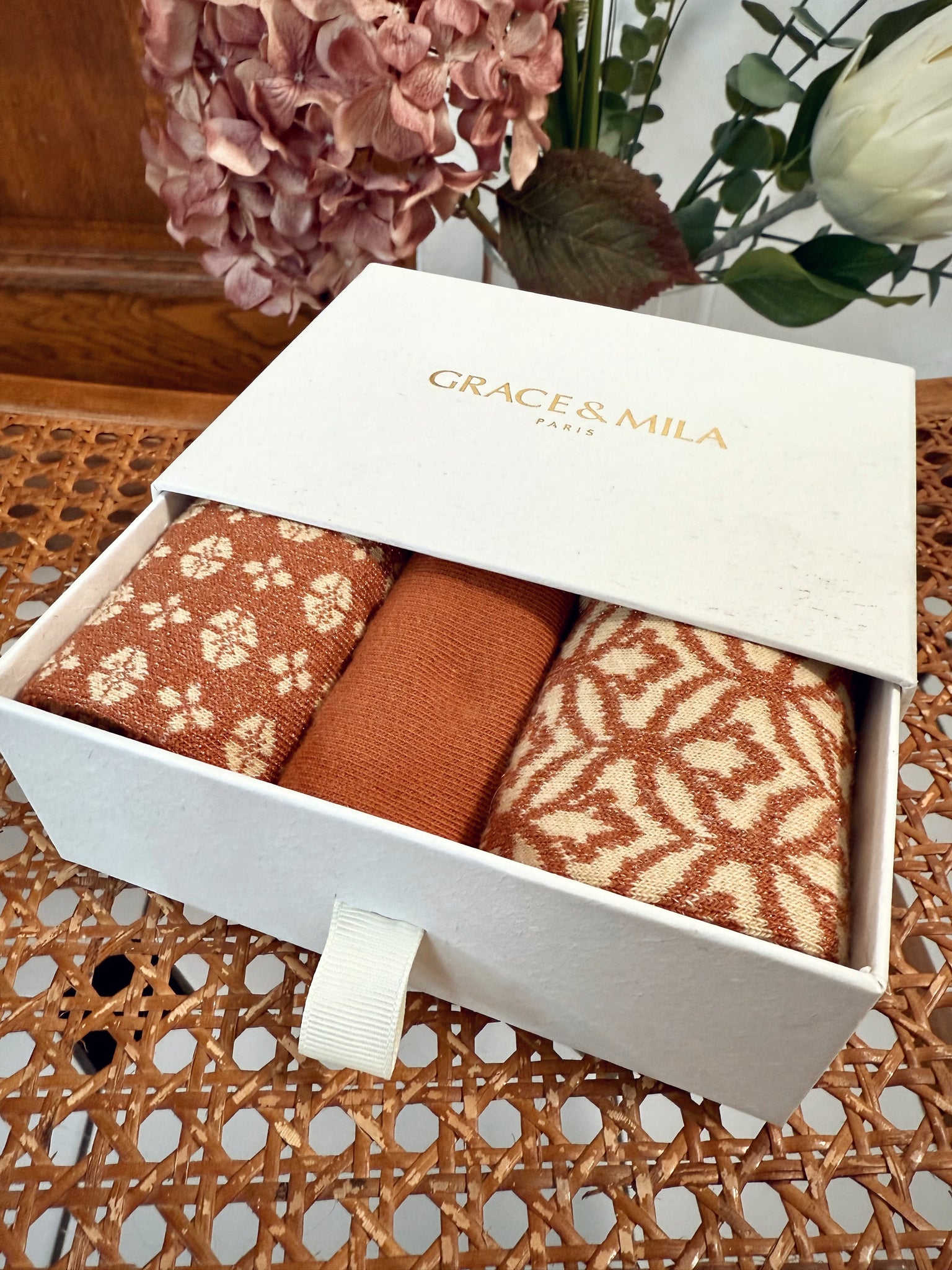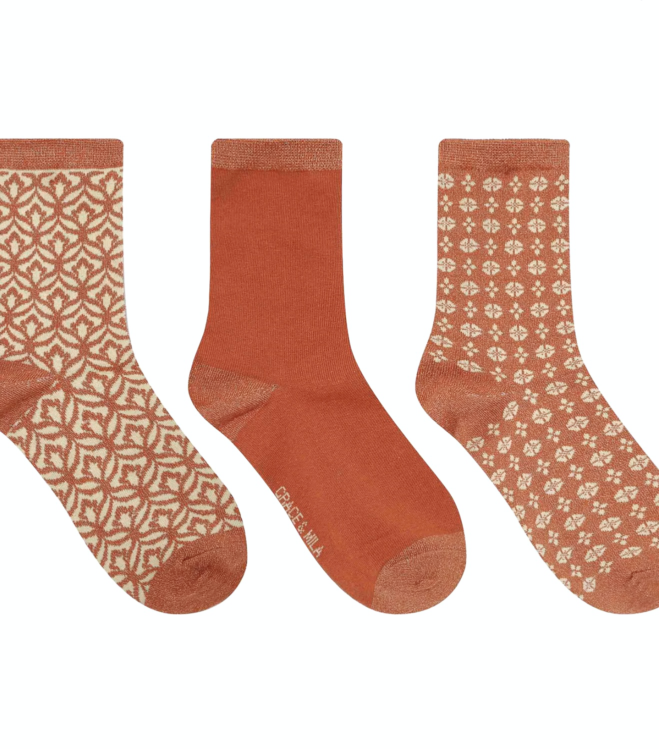 Coffret contenant trois paires de chaussettes à motifs jacquard .